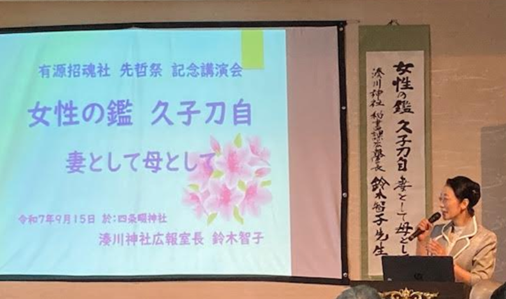 今年の鑚仰先哲は、昨年の「楠木正行(正成の嫡子)」に続き、その母「久子刀自」(正成の正妻)でした。湊川神社の神官で同社の広報室長で有らせられる鈴木智子さんより素晴らしい講話を頂きました。正行と久子の母と子の「敬愛」を、そして、我が国の忠君の鑑正成公の妻として、「日本女性の鑑」と称せられる、久子刀自の生き方を多くの日本女性に紹介したいという思いの籠ったとてもいいお話でした。楠木正成公をお祀りする湊川神社と嫡子正行公をお祀りする四條畷神社の結ぶ、時空を超えた追遠祭でした。