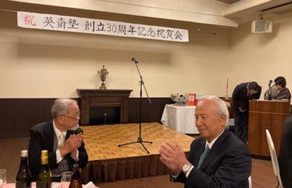 第二部の懇親祝賀会は会場を姫路総社会館に移して開催されました。参加者、門下生を代表して石川誠先生の来賓祝辞、阿比野建設阿比野会長の乾杯の音頭で祝宴は始まり、途中来賓、塾生のスピーチ、総合芸術プロデューサーの大野先生の唱歌「あかとんぼ」で宴はより華やかになりました。参集したすべての人が三木英斎先生の益々の健勝と、英斎塾の40周年大会を祈念して幕を下ろしました。