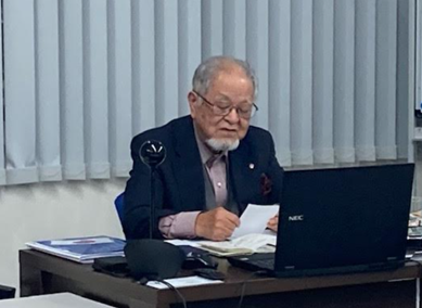 「心豊かに人間らしく生きるー聖賢の教えに導かれてー」という演題のもと、三木英斎先生の30年の求道に歩みに沿って、「人間として、また日本人としてこの世に生を享けたことの有難さに感謝」、「各自、この世における役割使命がある」、「朝こそすべて」、「人間らしくとは、五常、五倫を尊び、自分の分に応じて世のため、人のために生きる」、「豊かな教養を身につける」、「郷土愛・愛国心を持って、極東国際軍事裁判史観からの脱却」という非常に濃い内容の講和を短時間にまとめてお話頂きました。三木英斎先生は生涯、高い理想を持ち続け、心を輝かせて生き感恩報謝を込めて一燈照隅に行じ続けられています。そして、「心豊かにして人間的魅力のある、風格ある老人に、私はなりたい」と完熟の人生を目指して今後も歩んでいかれると確信いたしました。